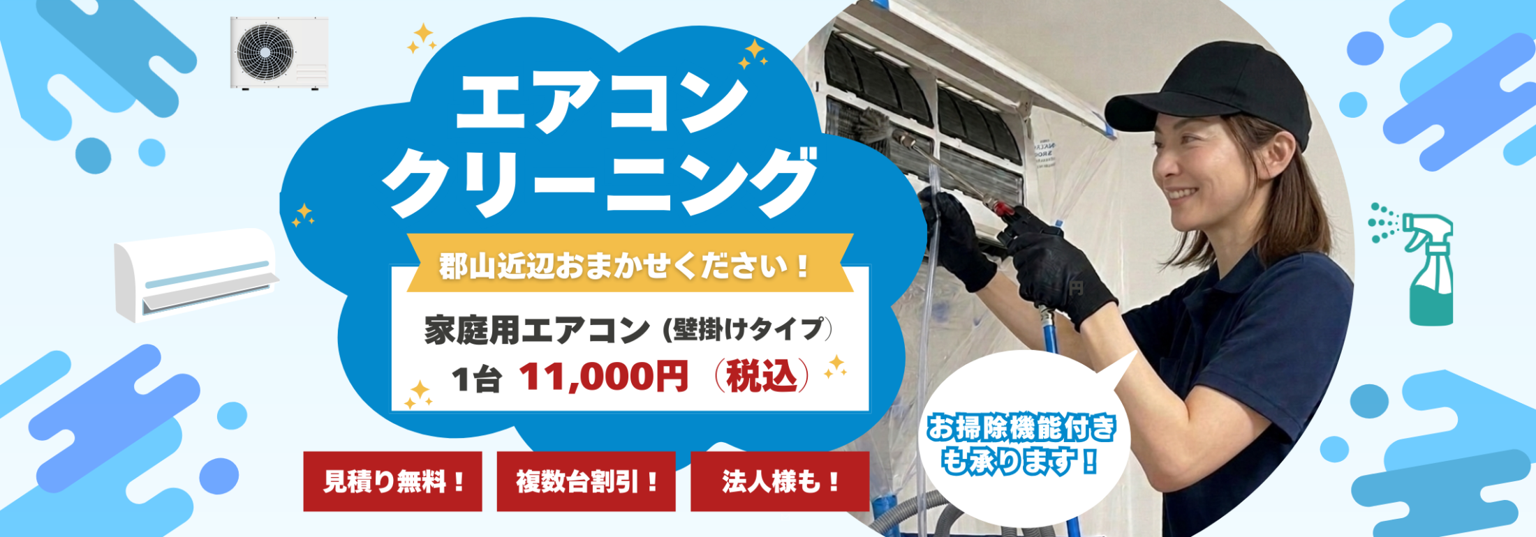 郡山市は盆地特有の気候のため、夏は湿度が高くカビが発生しやすく、冬は冷え込みが厳しい地域です。地域の住宅環境を考慮し、養生方法・洗浄方法・作業手順を調整しながら安全かつ効率的にエアコンクリーニングを行います。